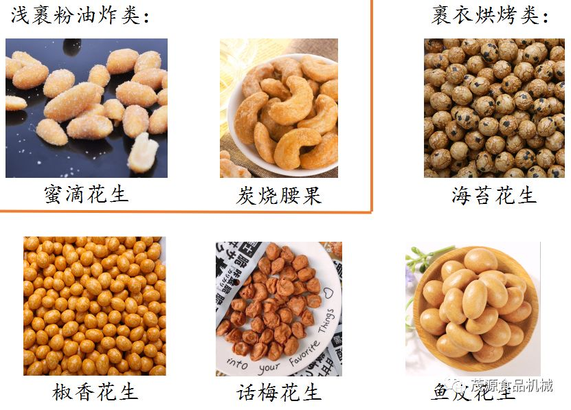裹衣/裹粉類產品是近年來較為熱銷的產品之一。通過糖漿向物料表面沾粘面粉+糕粉+變性淀粉+其他特色配料,來改變或賦予原有堅果/籽類所不具備的形狀/風味。